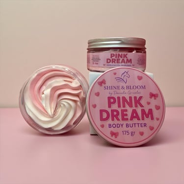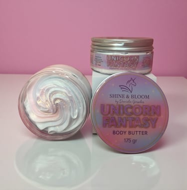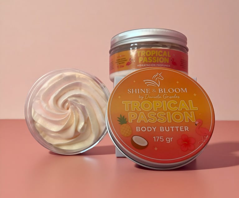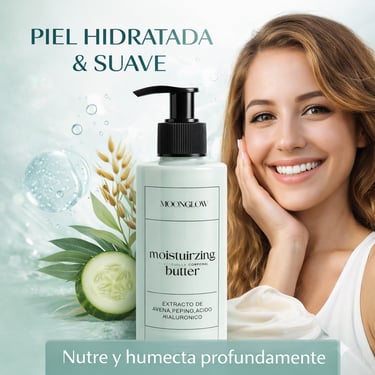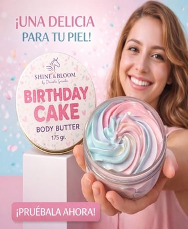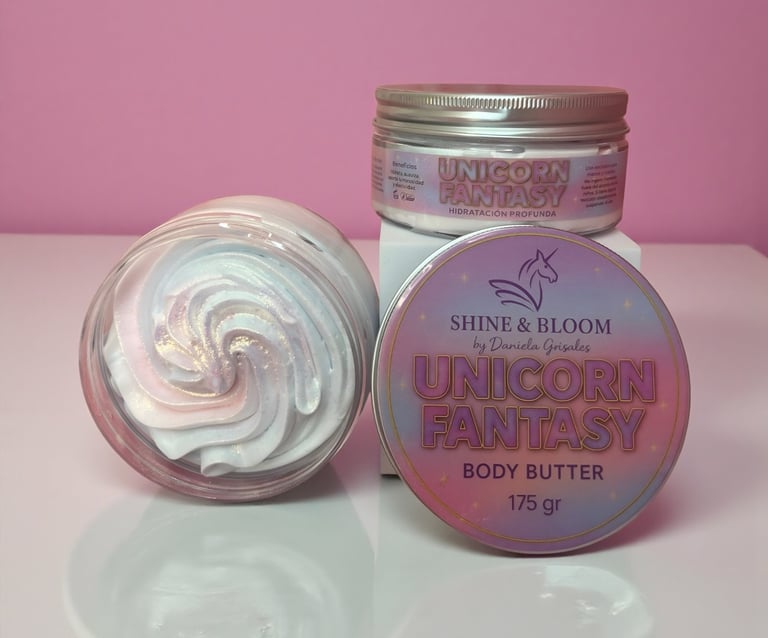 Mantequilla corporal sólida con aroma dulce a masmelo, extra hidratante, amigable con la piel y con sutiles brillos que iluminan naturalmente