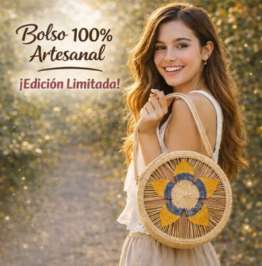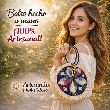 Tejido en técnica enrrollado, con detalles de flor colorida y con agarre a base de alambre forrado en iraca. Espacioso y de tamaño mediano, elegante y cómodo