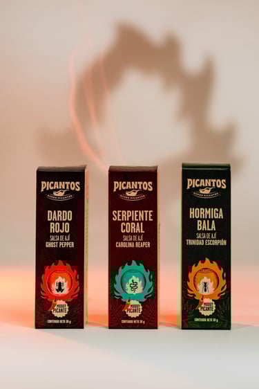 Dardo Rojo + Hormiga Bala + Serpiente Coral. Tres niveles de intensidad para amantes del picante. De suave fuego a explosión total.