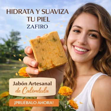 Jabón artesanal elaborado con caléndula, manzanilla y cúrcuma. Limpia suavemente, calma la piel y ayuda a mantenerla sana, luminosa y equilibrada
