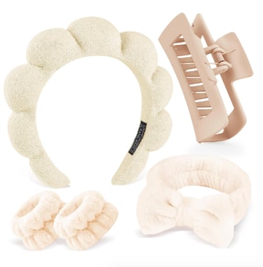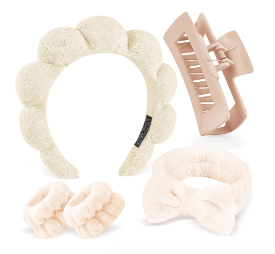 Zkptops Juego de 5 diademas de spa para lavar la cara, esponja, maquillaje, cuidado de la piel, tela de rizo de burbujas, pinzas de garra para cabello grueso
