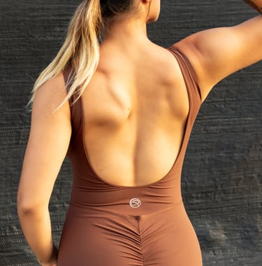 Enterizo de pierna larga con escote profundo en la espalda y realce en glúteos elaborado en nylon y spandex disponible en tallas s m l xl y en café y negro.