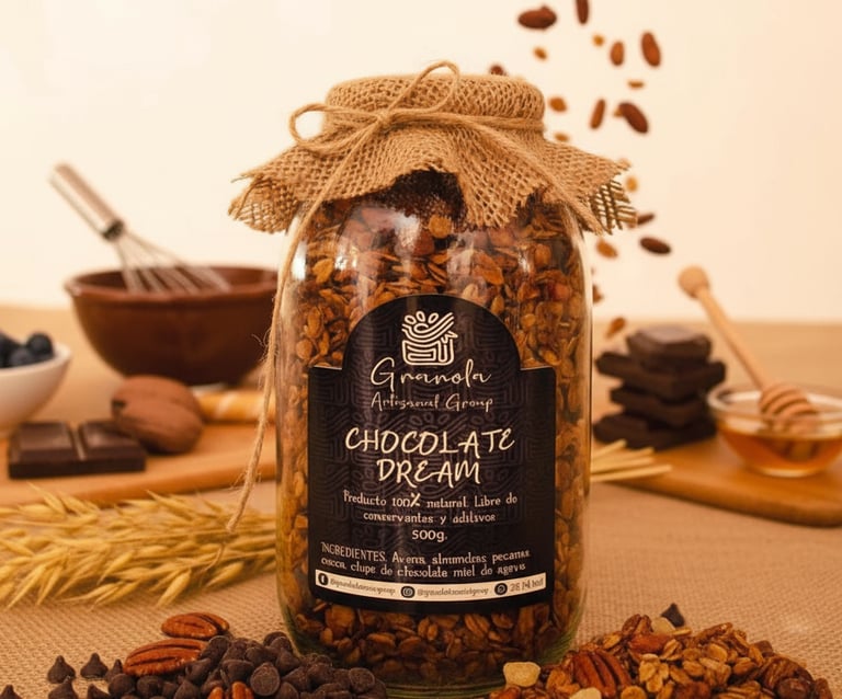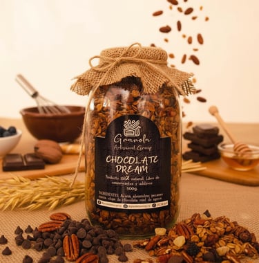 Granola de chocolate 500 gr con avena, nueces, almendras, miel orgánica de agave y chips de chocolate vegano. Delicioso snack saludable