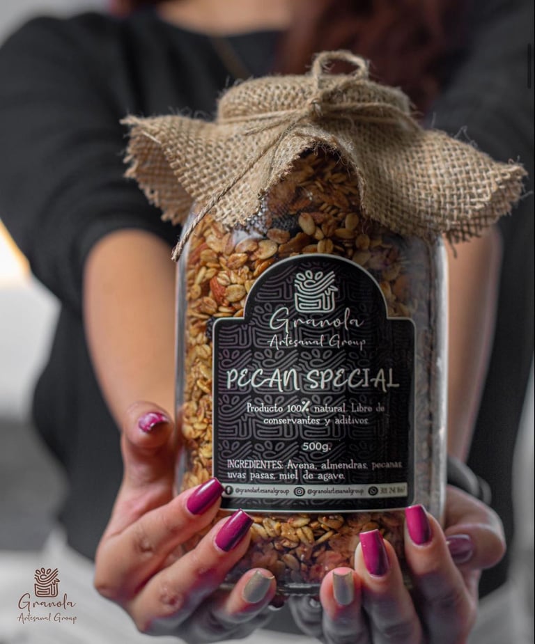 Granola artesanal con nuez pecans, uvas pasas, avena, almendras y miel de agave orgánica. Mezcla crujiente y saludable con toque especial. Energía natural
